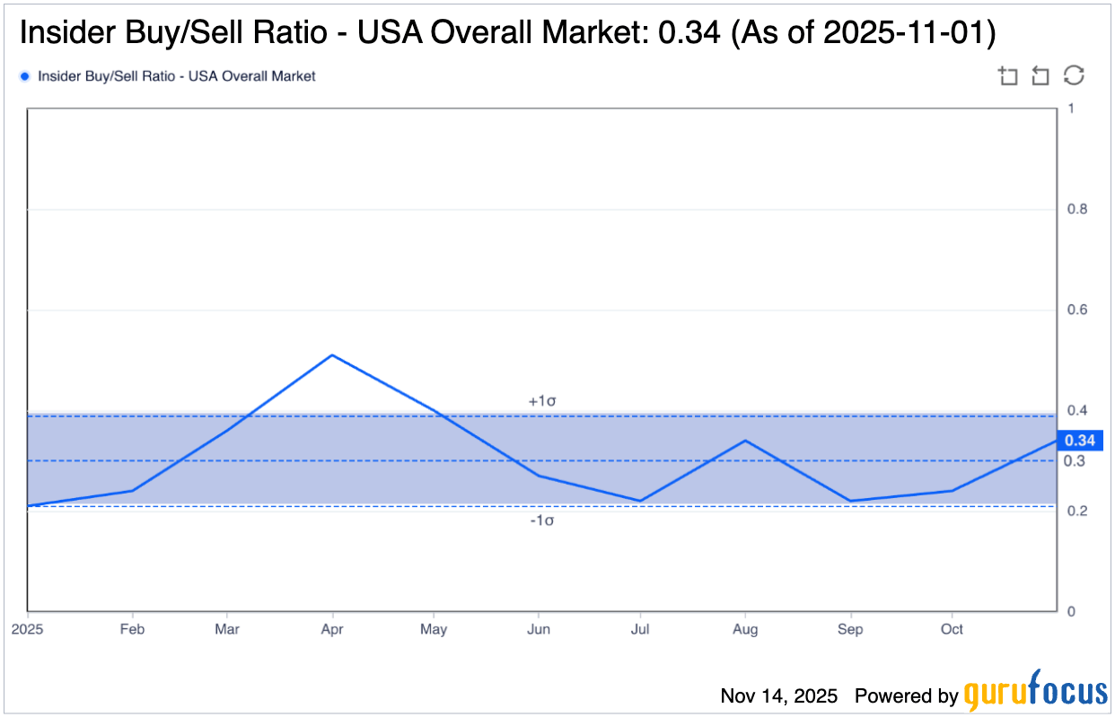 The U.S. market-wide insider buy/sell ratio has historically hovered around 0.22-0.34, with this week's concentrated buying in industrials and financials standing out against broader market trends.